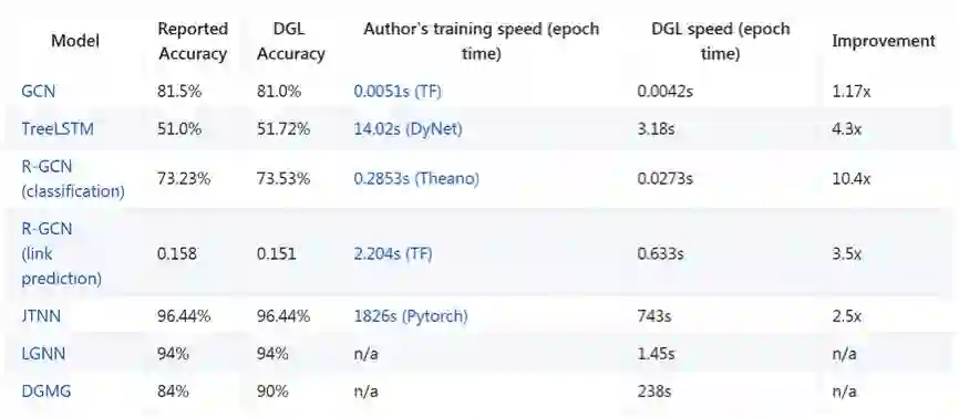 目前 DGL 提供了 10 个示例模型,涵盖了以上三种类别。其中除了 TreeLSTM,其余都是 2017 年以后新鲜出炉的图神经网络,其中包括几个逻辑上相当复杂的生成模型(DGMG、JTNN)我们也尝试用图计算的方式重写传统模型比如 Capsue 和 Universal Transformer,让模型简单易懂,帮助进一步扩展思路。