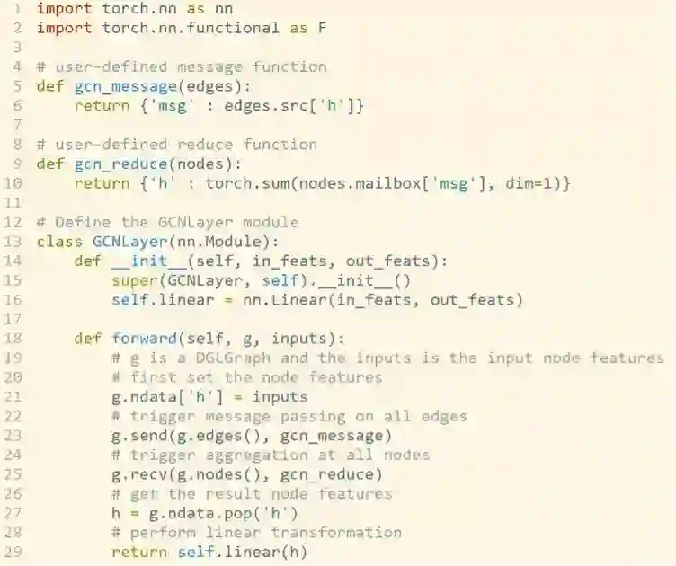 DGL 的编程模型正基于此。以下是图卷积网络在 DGL 中的实现(使用 Pytorch 后端):