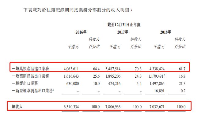 先看收入,过去3年(2016—2018),中烟香港通过上述四项业务共实现总收入63亿港元、78亿港元和70亿港元。其中,烟叶进口占大头,占到总收入的比重达到64%、70%和62%。