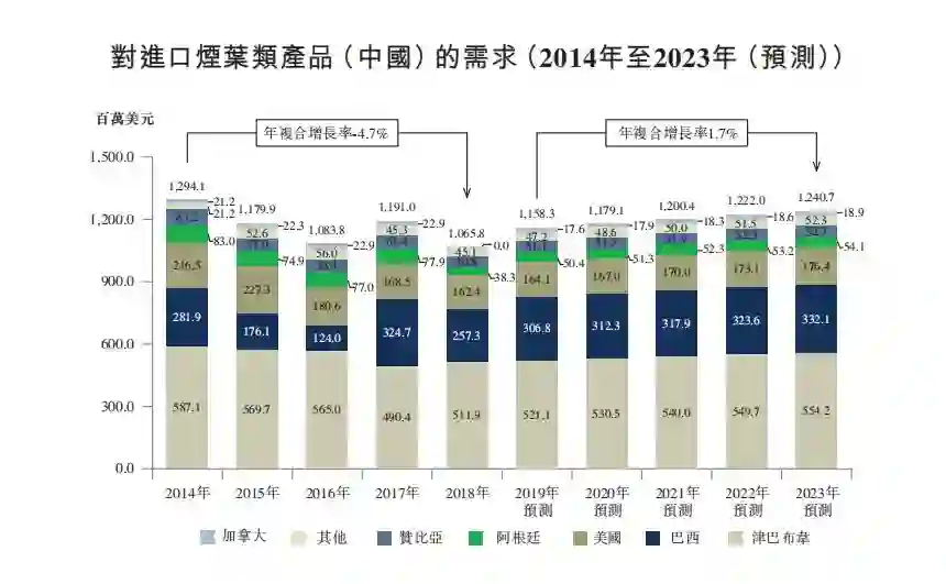 根据弗若斯特沙利文报告,未来五年中国对进口烟叶类产品的需求预计将以1.7%的年复合增长率稳定增长,到2023年将达到1240.7百万美元。