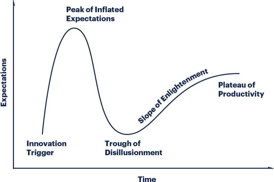 炒作在我们行业很常见。还记得 NoSQL 吗?或者是每个人都为之疯狂的微服务?或者是人工智能 / 机器学习的爆发?这样的例子不胜枚举。人们总是会对新的、突破性的技术和想法感到兴奋。Gartner 在描绘技术炒作周期方面做得非常出色: