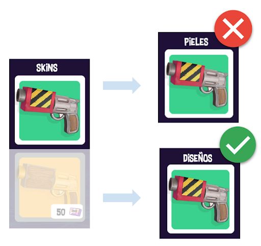 △ 英语单词 "skin" 被错误地翻译为 "pieles",其字面意思是 "人类的皮肤"。正确的翻译应该是 "diseños",意为 "设计"