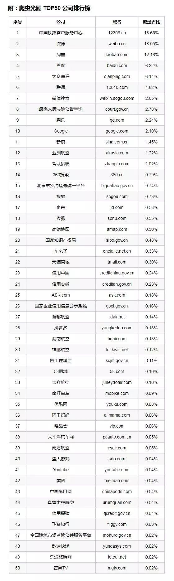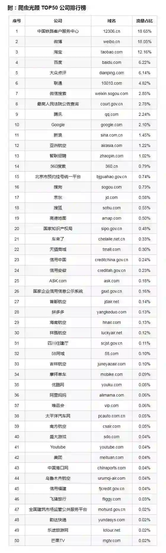 排名第1的是“中国铁路路客户服务中心”。无数像幺哥一样的游子,他们奋斗在一个远离家乡的城市,为了让家人有更幸福的生活。正是他们难以买到过年回家车票的事实,才把 12306 推上了爬虫榜的第一名。