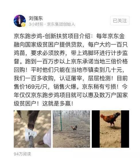 这让文摘菌想起来五月份的时候,刘强东就已经在今日头条发布了京东版的“小鸡快跑”消息。据称带着鸡环的小鸡跑到一百万步以上会被京东以一百多元的价格收购,而且这群跑步鸡必须放养。