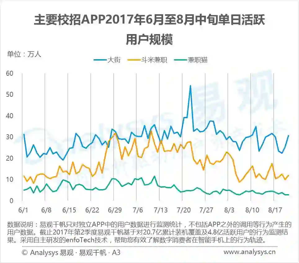 尽管7、8月是传统的招聘淡季,但由于暑期学生闲置人力资源的释放,市场兼职需求迎来井喷。在校招APP中,斗米兼职和兼职猫两款面向学生的兼职招聘服务平台均在7月录得了超过50%的月活跃用户增幅,这使其成为最典型的“暑期档产品”。学生进入休息阶段,大量的学生希望在假期通过兼职丰富假期生活的同时赚取一定的零花钱,是兼职APP在暑期大幅增长的主要原因。