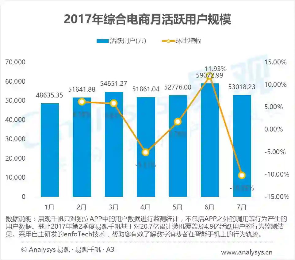 从头部APP数据来看,进入7月后,主要电商平台的活跃用户规模曲线所体现出来的下降趋势较为明显。数据曲线的下滑趋势,虽然也收到了传统商贸淡季的影响,但更多的是购物节的负面影响的体现:全行业陷入节后低迷泥潭。
