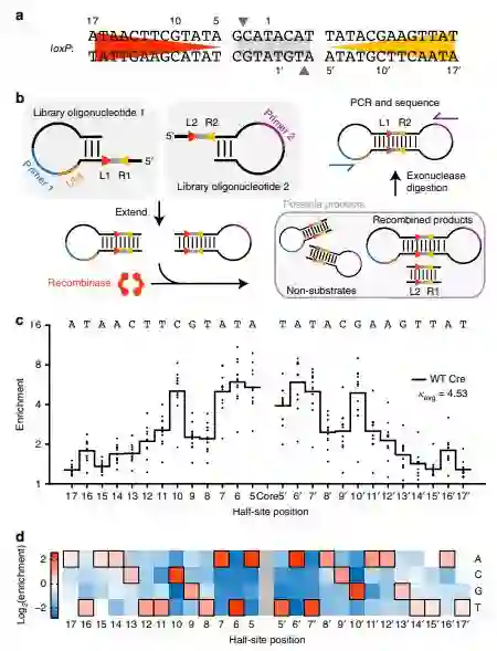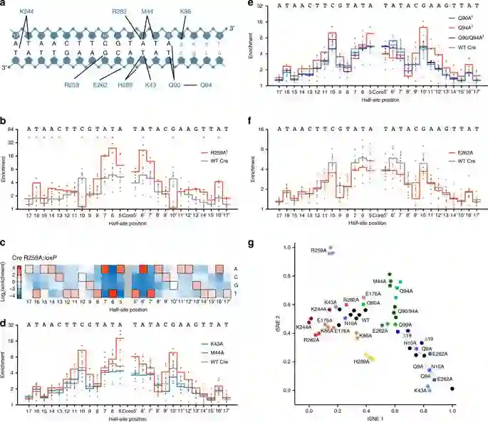 为了表征相互作用,研究人员构建了14个Cre突变体,其中已知残基的Ala取代与loxP接触,纯化每个变体,并进行Rec-seq 绘制特定残基与Cre的DNA序列偏好之间的功能关系。Cre突变体和野生型Cre的Rec-seq谱的比较产生了对每个残基对整个loxP位点的DNA特异性的贡献的新见解。