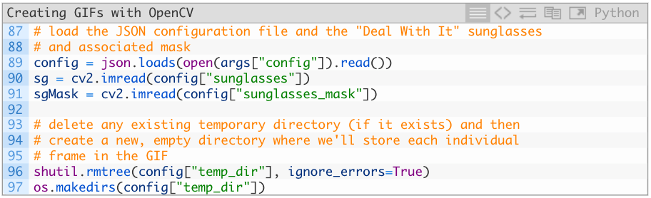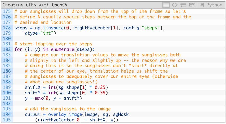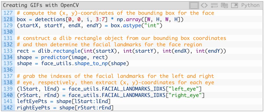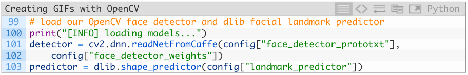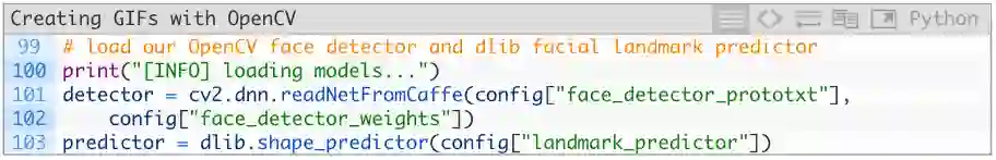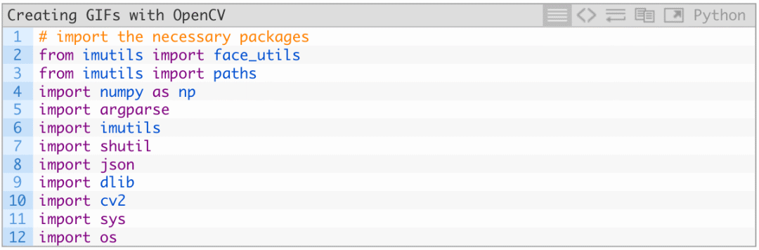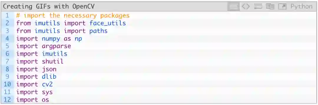 创建一个新文件夹,将其命名为create_gif.py,插入以下代码,载入imutils、dlib、OpenCV: