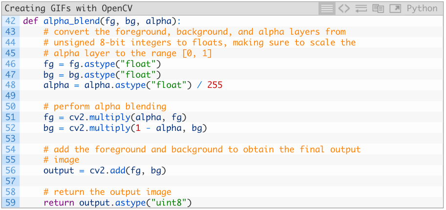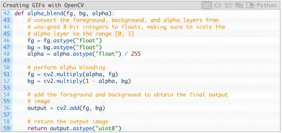 46—48行中,我们将前景、背景和alpha层转换为[0,1]之间的浮点。接着,我们在51和52行执行alpha合成。最后,添加前景和背景,得出输出,返回函数(37—40行)。