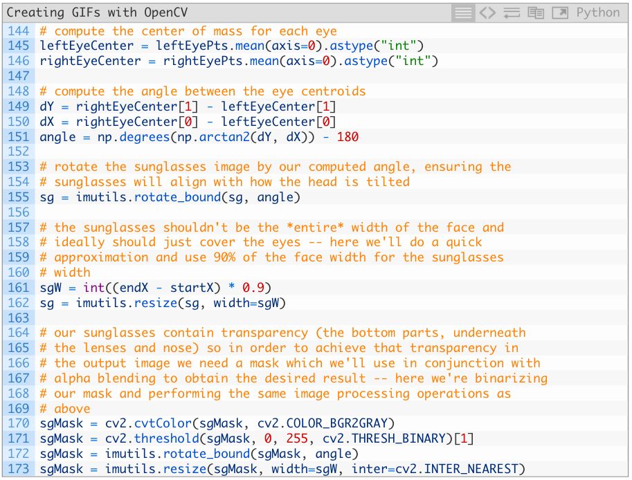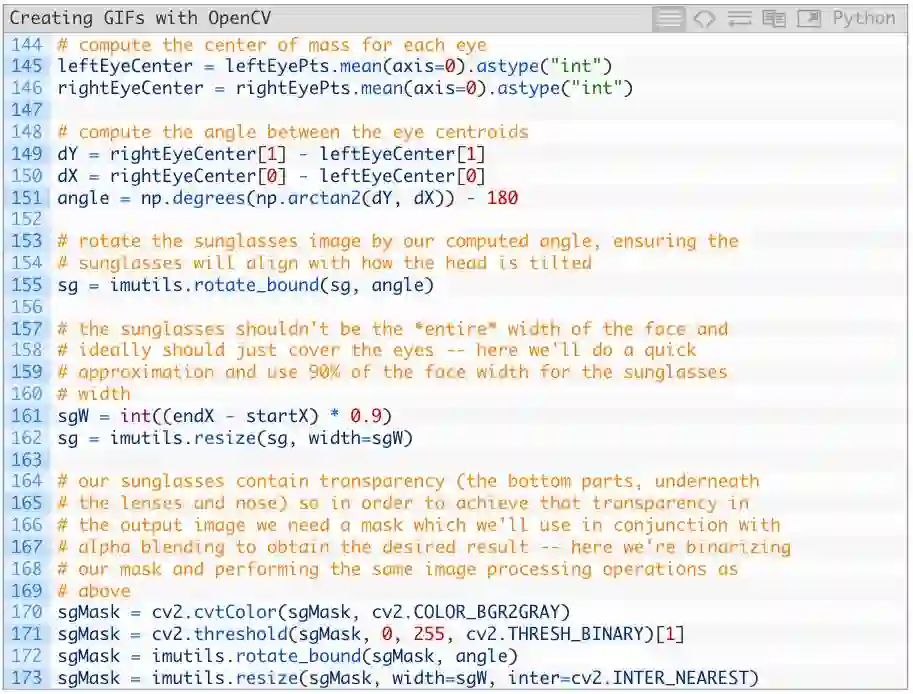 首先,计算每只眼睛的中心以及二者之间的角度(145—151行)。之后对“墨镜”进行旋转(155行)和尺寸缩放(161和162行)。