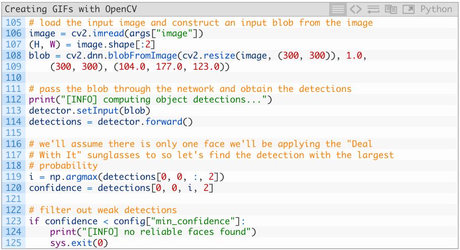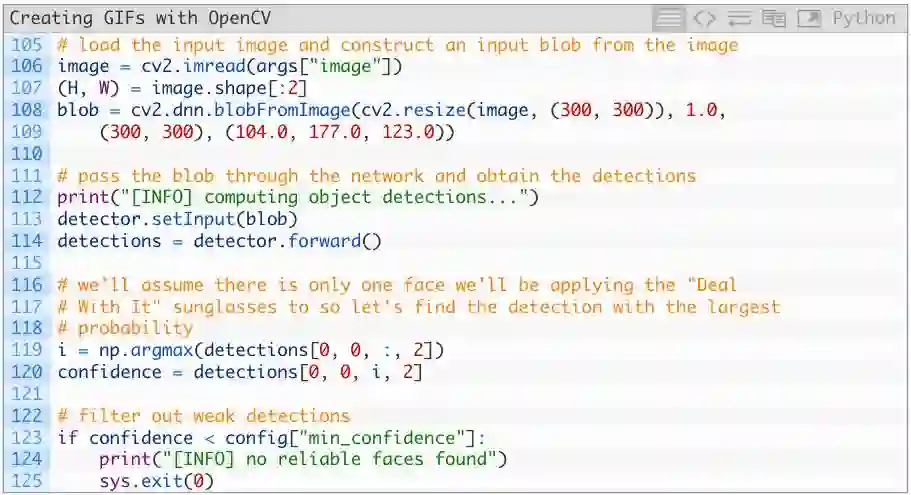 确定人脸检测的概率,检查置信区间(119—124行)。如果标准不符合,我们就简单地推出脚本(125行),反之则继续。