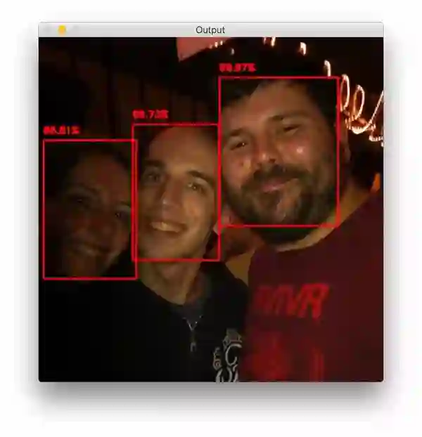 为了下载OpenCV的深度学习人脸检测,我们会调用cv2.dnn.readNetFromCaffe(101和102行)。dnn模块只能在OpenCV3.3及之后的版本中使用。人脸识别器会呈现出如下结果: