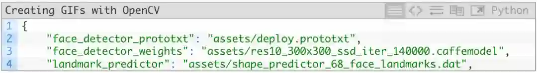 第2行和第3行是OpenCV深度学习人脸探测器的模型文件,第四行是dlib的面部标志探测器的路径。