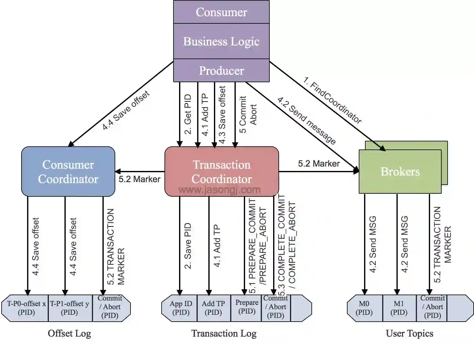 作为sendOffsetsToTransaction方法的一部分,在处理完AddOffsetsToTxnRequest后,Producer也会发送TxnOffsetCommit请求给Consumer Coordinator从而将本事务包含的与读操作相关的各<Topic, Partition>的Offset持久化到内部的__consumer_offsets中,如上图步骤4.4所示。