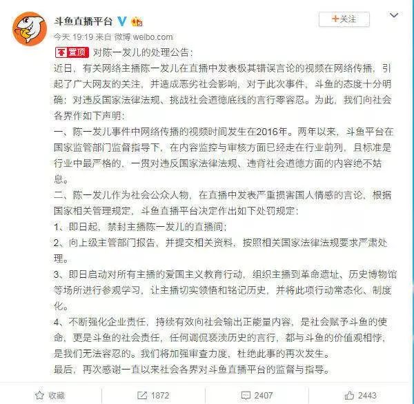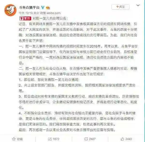 对于平台主播「陈一发儿」的错误言论风波,斗鱼在昨晚发布处理公告,表示将封禁其直播间,并向上级主管部门报告,提交相关资料,按照国家法规严肃处理,还将启动对所有主播的爱国主义教育行动,组织主播到革命遗址、历史博物馆等场所进行参观学习,并将全面清查平台的直播内容。