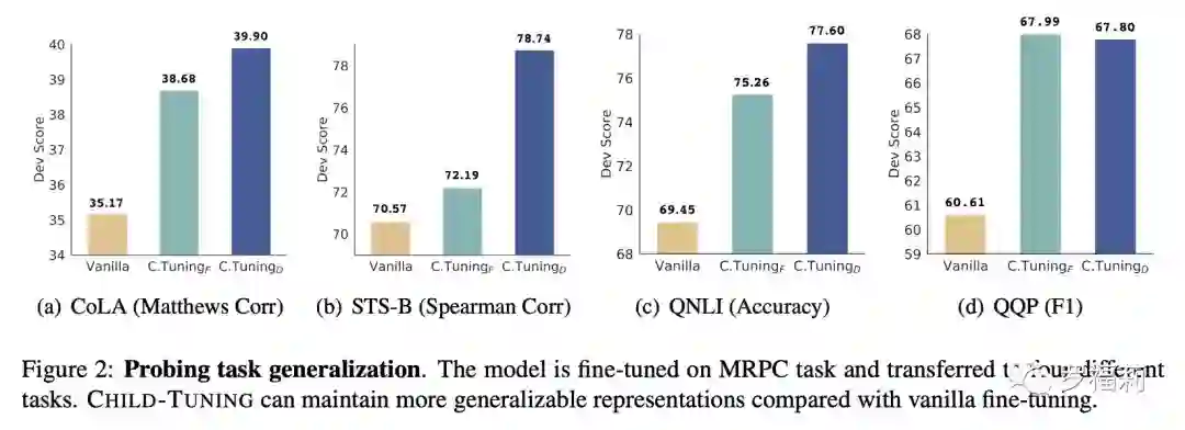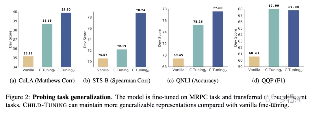 类似地我们还进行了任务迁移实验(Task Transfer),即在一个源任务上进行Fine-tune,之后将预训练模型的参数冻结住,并迁移到另一个目标任务上,仅仅Fine-tune与目标任务相关的最顶层的线性分类器。下图展示了在以MRPC为源任务,迁移到CoLA,STS-B,QNLI和QQP任务上的实验结果,Child-Tuning相比Vanilla Fine-tuning在任务迁移实验上同样具有明显的优势,说明模型通过Child-Tuning的方法有效提高了泛化能力。