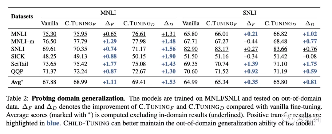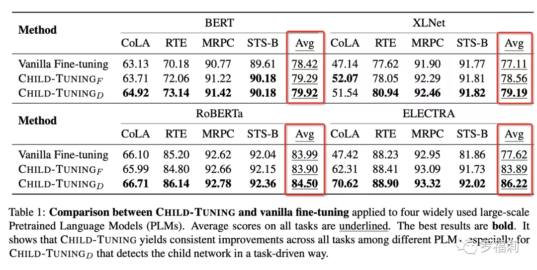 a) 动机不同:这些工作主要聚焦于微调尽量少的参数而模型效果不会损失太多(所谓的paramter efficient learning),而Child-Tuning主要关注如何更好的提高模型的效果与泛化性能;