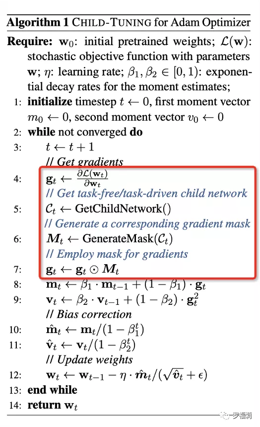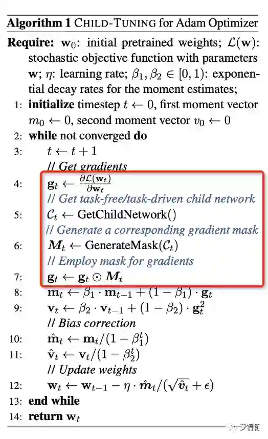 总的来说,(在基于Adam优化器下的)Child-Tuning的伪代码如图4所示,最关键的部分在于红框内的内容,即发现Child Network,以及根据Child Network生成梯度掩模,从而实现仅对Child Network中的参数进行更新。