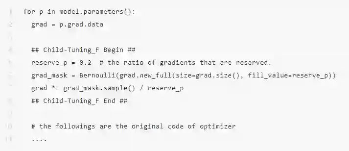 Child-Tuning代码已开源到阿里预训练体系AliceMind,关于实现的更多细节可以参看: