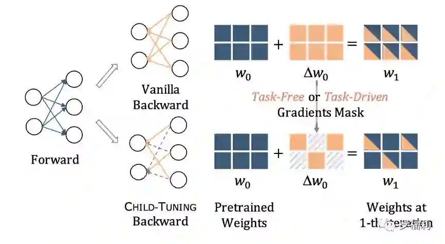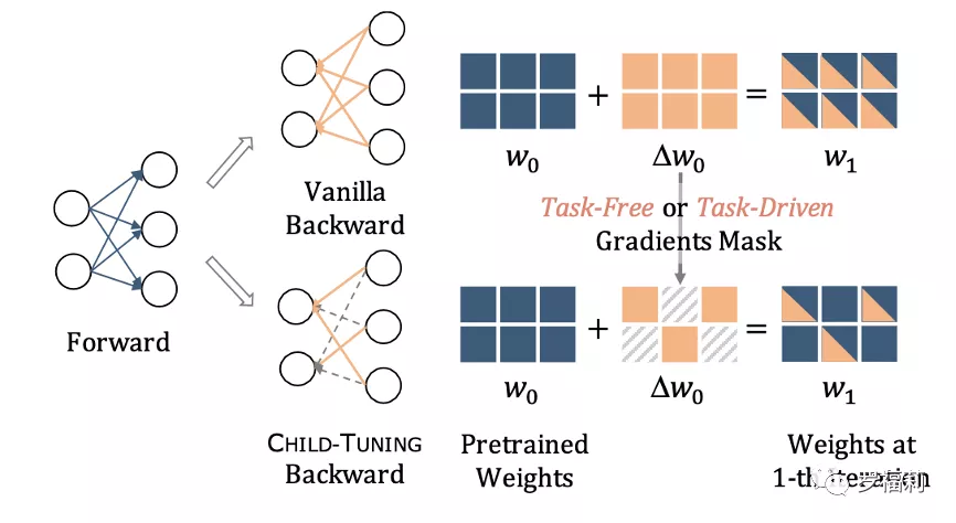 因此,越来越多工作开始聚焦于如何解决这种不匹配现象,缓解大规模预训练模型在下游任务中的过拟合。本文介绍的Child-Tuning围绕这个问题进行探究,从backward参数更新的角度思考问题,提出一种新的Fine-tuning策略,在Fine-tuning过程中仅更新对应的Child Network,在不同下游任务中相比Vanilla Fine-tuning有明显提高,如基于BERT模型在四个不同数据集中平均带来1.5个点的提升,在ELETRA上甚至提升8.6个点。