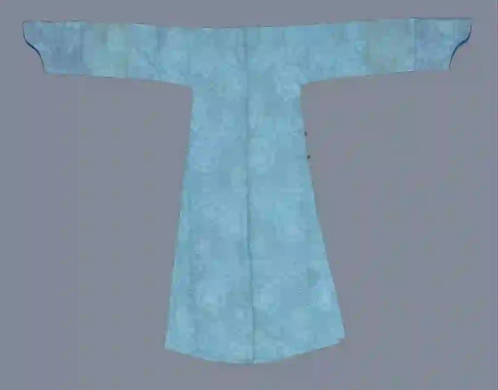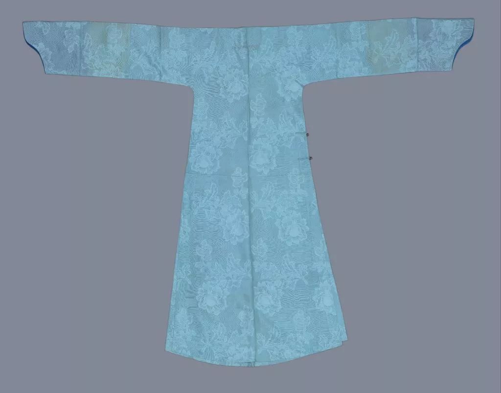 月白色泰西纱常服袍,清光绪,身长138cm,两袖通长188cm,袖口宽24.50cm,下摆宽72cm,左右裾76cm。故宫博物院藏。