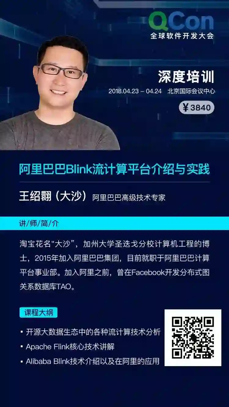 如果你也对实时计算感兴趣,请关注 2018年 4月 23日到 24日,我们在北京国际会议中心举办的 QCon深度培训。在会上,阿里巴巴的高级技术专家王绍翾和邓小勇将为大家带来 阿里巴巴 Blink流计算平台介绍与实践,详细的介绍 Blink的前世今生,现在报名立享 8折优惠,点击“阅读原文”即可了解更多详情。或添加 chenxi988625咨询。