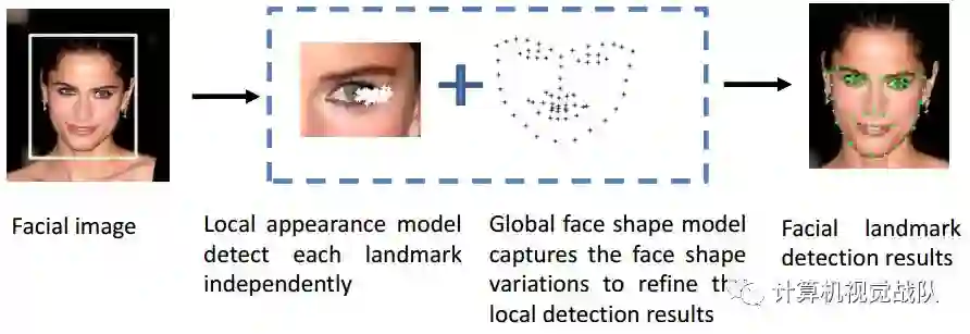 整体方法显式地利用整体面部外观信息以及全局面部形状进行面部关键点检测(下图)。接下来,我先介绍经典的整体方法:主动外观模型(AAM);然后,介绍它的几个扩展。
