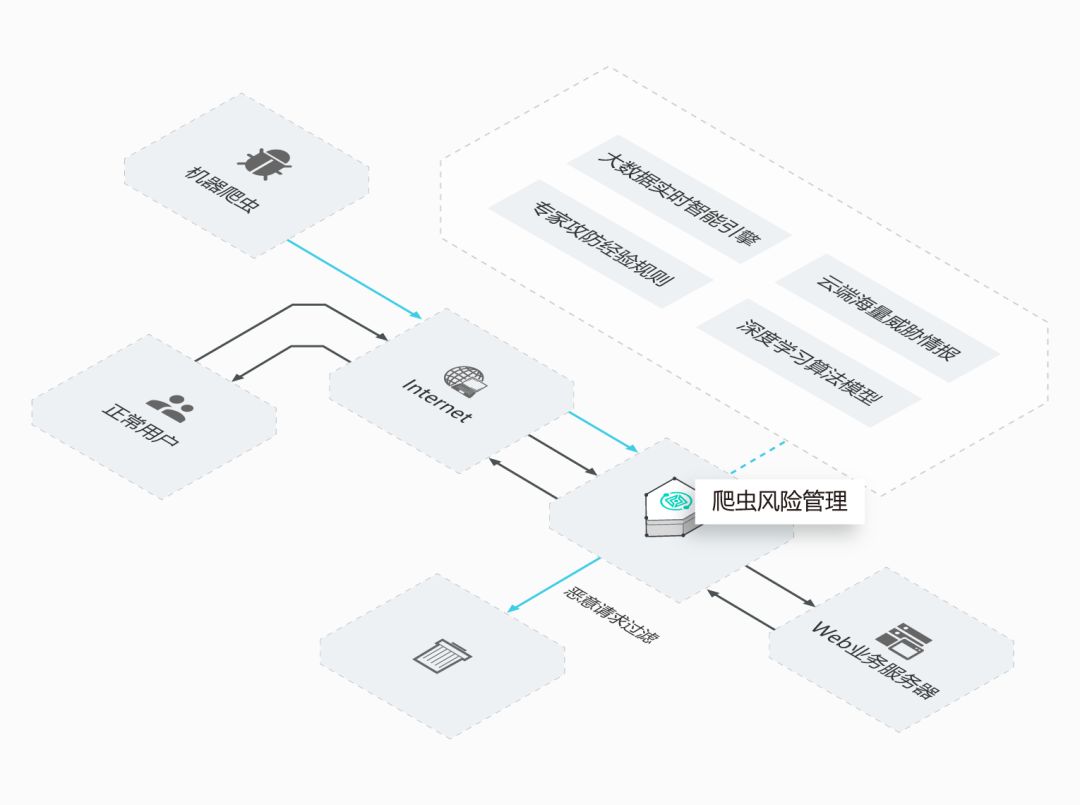 爬虫的多变需要辨别,云盾爬虫风险管理产品能快速甄别爬虫的行为特征,对不同的爬虫做不同的处置,该放的放,该杀的杀,遇到可疑的爬虫还可以做一个挑战或者校验,多验一次身来做最终判断。