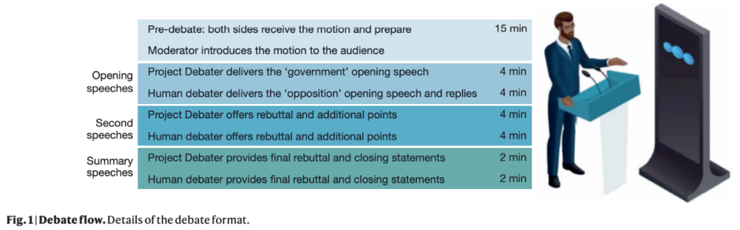 在 1v1 辩论中,该系统进行一个 4 分钟的演讲,人类对手对此作出回应。然后,「Project Debater」对对手的观点做出回应,发表第二个 4 分钟辩论,对手用 4 分钟的时间进行反驳。最后,双方都做了 2 分钟的最终陈述。
