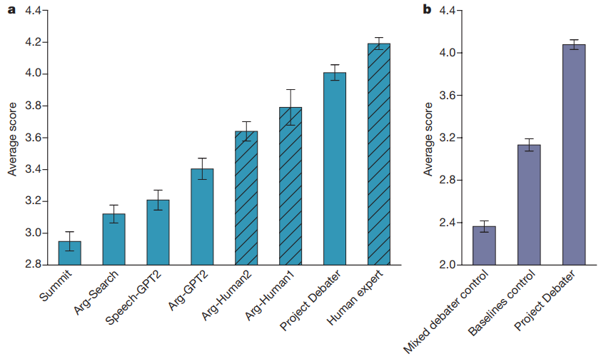 构成优秀论证的模型是多样化的,而构成优秀辩论的模型仅仅相当于形式化的直觉。因此,当时 Project Debater 的性能评估仅仅是通过询问人类观众是否认为它「表现不错」来完成的。在几乎三分之二的辩题中,人类认为是这样的。