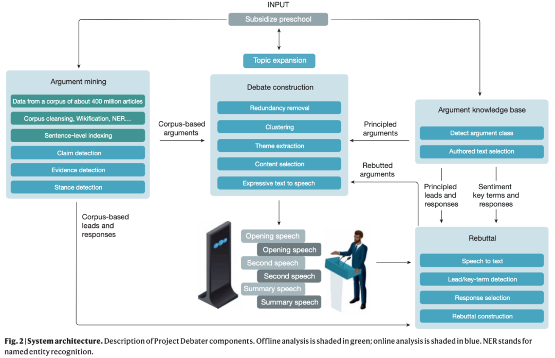 辩论赛的一大难点是论据挖掘,在很长时间里这一能力都被认为超出 AI 能力范畴。但 AI 技术进展、日益成熟的工程技术和广泛的商业需求促使该领域快速发展。IBM 海法研究院 Noam Slonim 博士等人决定开启一项挑战:开发一个能够与人类进行现场辩论的完全自主系统。