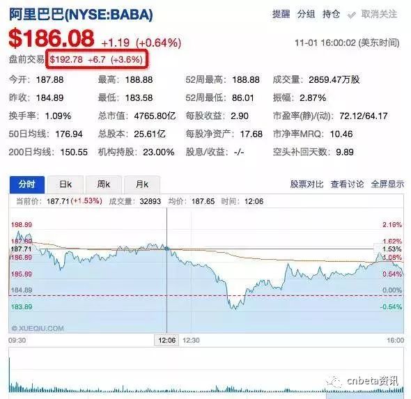 财报公布后,阿里巴巴盘前股价大涨,逼近193美元/股,市值或打破5000亿美元大关,京东和阿里巴巴,中间已经差了整整一个腾讯!