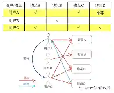(下图就是一个例子,对于用户 A,根据用户的历史偏好,这里只计算得到一个邻居 - 用户 C,然后将用户 C 喜欢的物品 D 推荐给用户 A。)