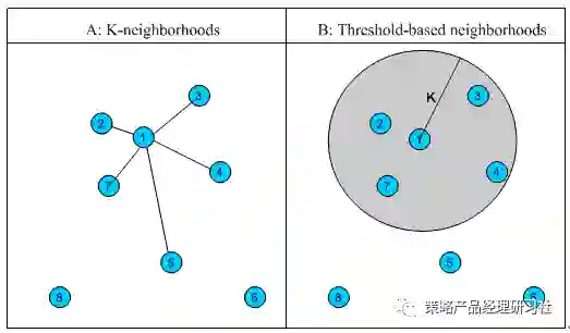 【原理】:与计算固定数量的邻居的原则不同,基于相似度门槛的邻居计算是对邻居的远近进行最大值的限制,落在以当前点为中心,距离为 K 的区域中的所有点都作为当前点的邻居。