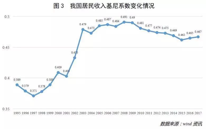 数据显示,我国居民收入的基尼系数自2000年首次超过警戒线0.4以来,总体上呈现出先攀升后稳定的态势。但值得注意的是,2003年至今,基尼系数从未低于过0.46,而最近三年,更是逐年增大,由2015年的0.462升至2017年的0.467(参见图3)。这也充分证明,我国居民间的收入差距已经相当严重,而且正有愈演愈烈之势。