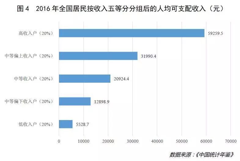 根据收入水平的不同,我们将全国居民人数进行五等份分组来加以考察后发现,2016年我国收入水平最高的前20%数量的居民,人均可支配收入为59259.5元,遥遥领先其他80%的人群;即便是位于第二梯队的中等偏上收入群体,人均可支配收入也只有31990.4元,刚刚超过高收入群体的一半;而收入最低的20%人群,人均可支配收入仅仅为5528.7元,不到高收入人群的1/10(参见图4)。