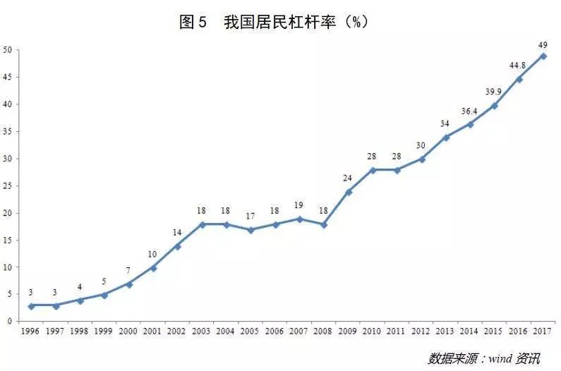 从图5可以看到,1996年我国居民杠杆率只有3%,2008年也仅为18%,但是自2008年以来,居民杠杆率开始呈现迅速增长态势,短短六年间翻了一倍,达到36.4%,到了2017年已经高达49%,较之2008年激增了近30个百分点,也高于国际上大多数新兴市场国家的平均水平。值得一提的是,美国居民部门杠杆率从20%上升到50%以上用了接近40年时间,而我国只用了不到10年。