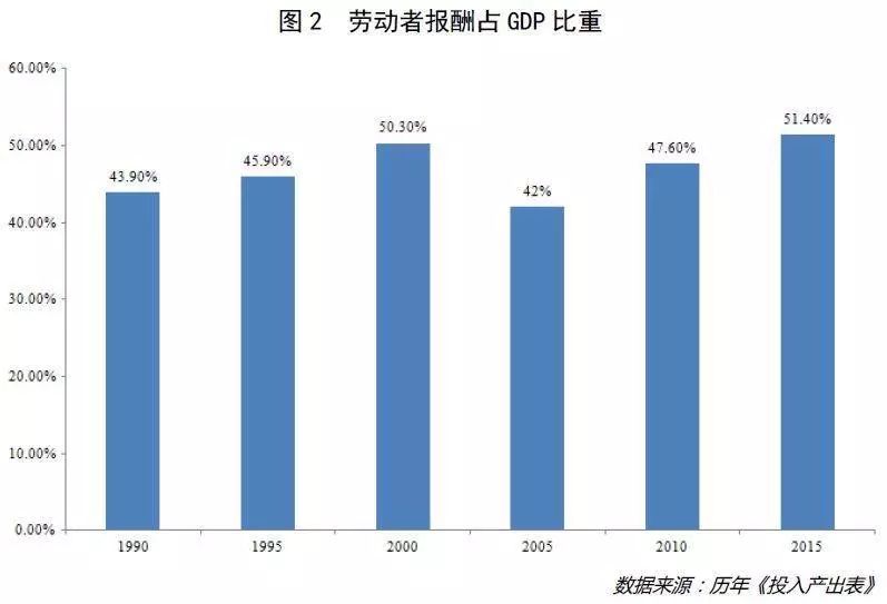 从数据看,自1990年以来,我国劳动者报酬占GDP的比重从来没有高于过52%,2000年~2010年期间更是低于一半(参见图2)。而这一数字在日本,则是常年保持在55%的高位上。
