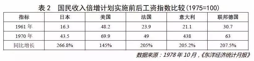 第五,国民生活水平显著提高:1961年~1970年,日本人均国民收入由395美元增加到1592美元,10年间实际工资收入金额是计划的1. 52倍,工资指数增速更是位居主要发达资本主义国家之首(参见表2)。