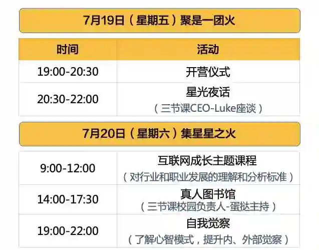 深度联结互联网圈的职场人和大学生,通过3天3夜的高强度线下交流,和未来的内部权益分享,打造一个长期彼此赋能的互联网核心人才圈。