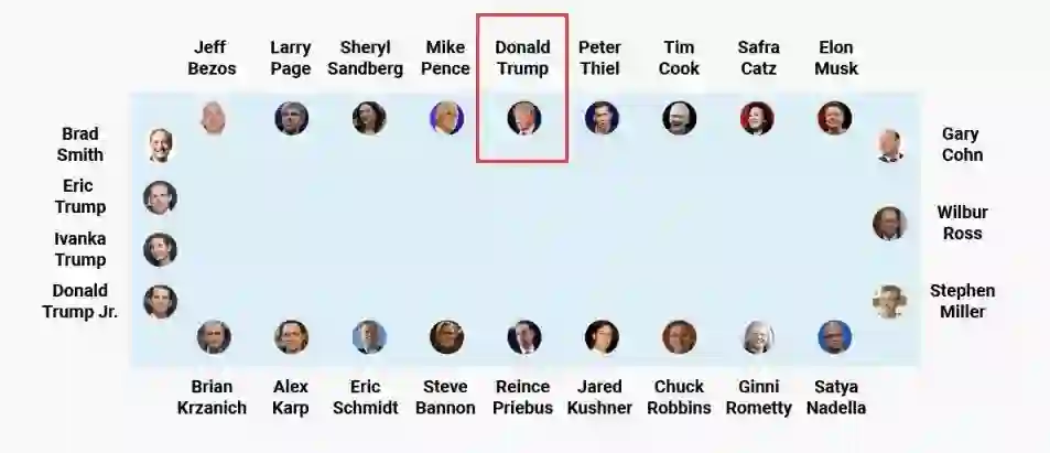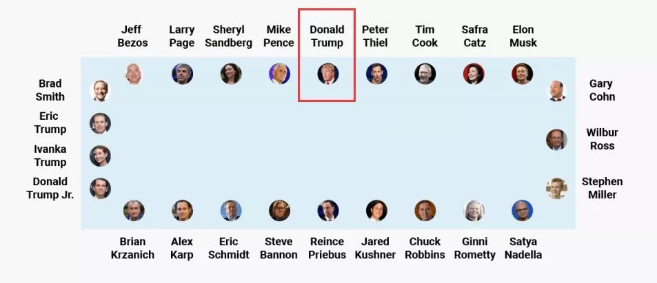 这是美国网站Business Insider公布的特朗普与美国互联网大佬第一次开会时的座位表