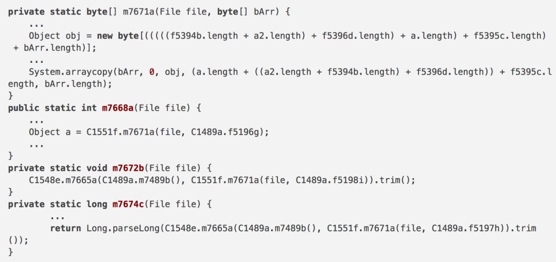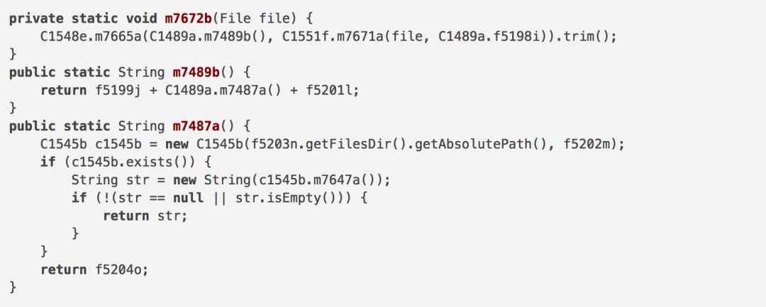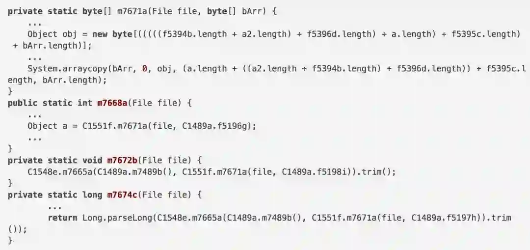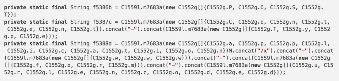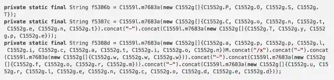 攻击者使用了工具ProGuard来对字符串和函数名进行了混淆,所以前述的我找不到任何URL字符串的原因就在于此。ProGuard是一个压缩、优化和混淆Java字节码文件的免费的工具,它可以删除无用的类、字段、方法和属性。解码之后,可以看到,其中包含了以下信息: