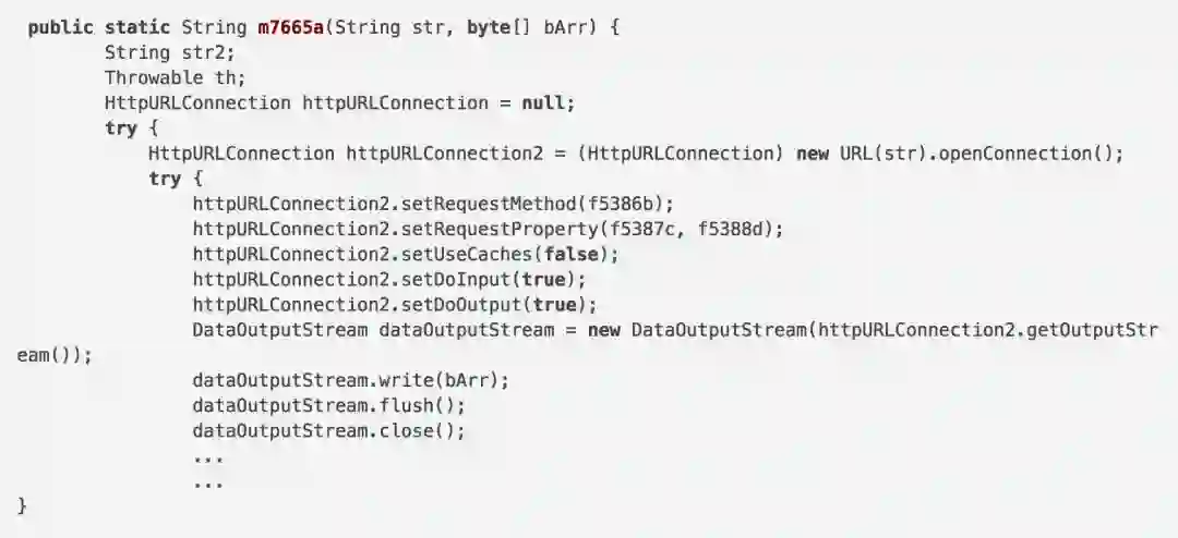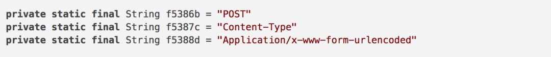 这个函数调用了两个参数,其中str代表回调请求web服务器的URL,bArr代表发送到web服务器的数据。还可以看到,请求方法定义在了变量f5386b中,而请求属性则定义在了变量f5387c 和 f5388d中: