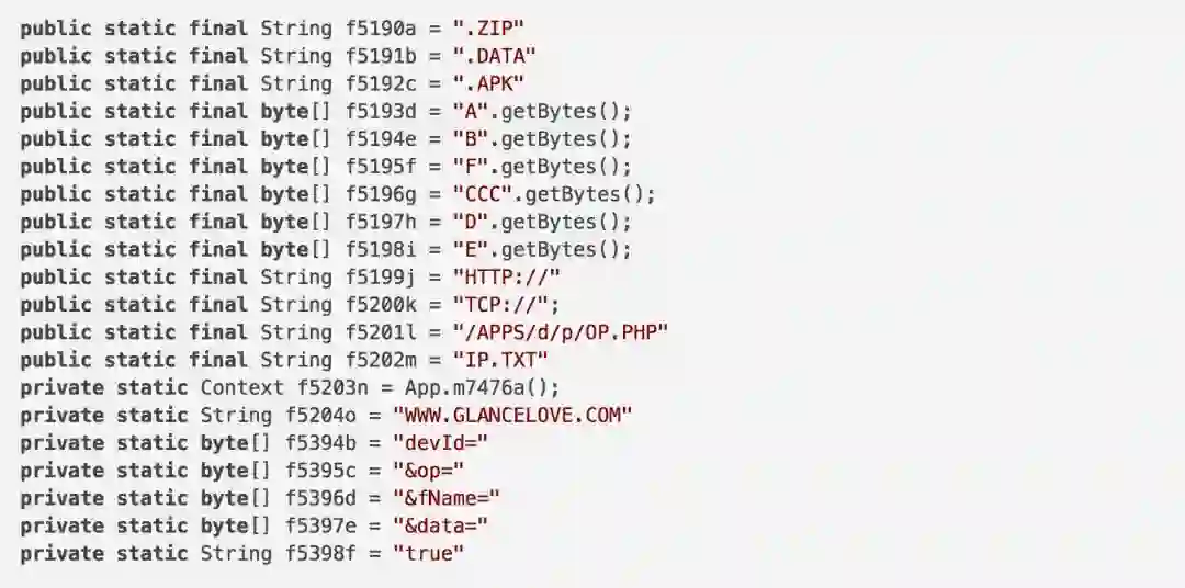 从以上信息中可知,我可以利用参数 devId、op、fName和data来构造一个发往攻击控制服务器WWW.GLANCELOVE.COM的POST请求,其中参数devId、op和fName的值都比较好猜,但是参数data我就不知道是什么了。所以,我又从以下反编译代码中进行了分析: