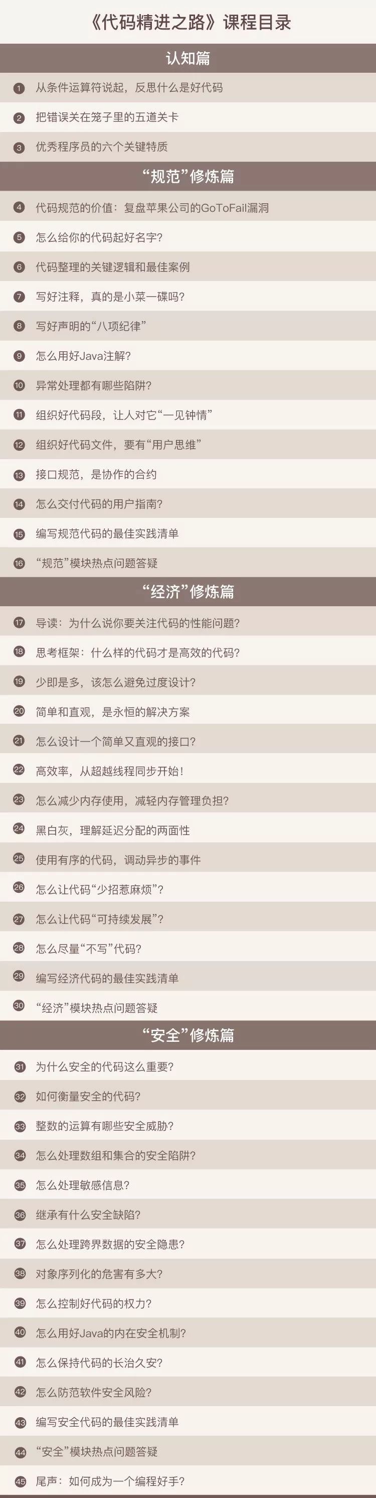 方法实操:专栏紧贴工作实际场景,会告诉你如何消除代码的安全隐患,并且教你一些高频代码问题的最优处理和预防方案,这些都是非常实用的。