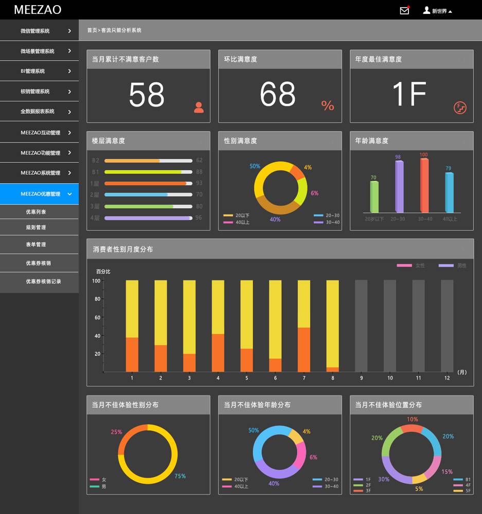 今年9月第一周,团队将整套系统正式交付给王府井管理人员。21个摄像头可覆盖入口、滚梯及重点服务柜台的全部重要营业区域,而整合的人工智能分析引擎从摄像头的影像可以提供客流(消费者)人数、消费者性别比例、消费者年龄区间、各楼层消费定位分析、消费者体验分析以及服务质量分析等8个维度的分析图表,直观地将几乎所有与消费者有关的数据展现在管理者面前。