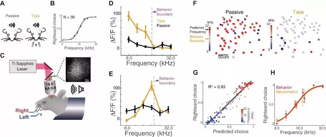 图注:A、头部固定小鼠的行为范式。被动情况下小鼠只需要听声音,不需要做出反应。B、小鼠行为学的心理物理曲线。C、双光子成像示意图。D、对于声音的类别有选择性反应的示例神经元。E、对于类别的分界处的声音有特意选择性的示例神经元。F、使用群体神经元活动来预测单次实验中小鼠的行为,与小鼠实际的行为选择具有显著的相关性。G、群体神经元活动的解码结果跟小鼠的抉择行为显著相关。H、通过解析群体神经元活动得到的神经测量曲线跟小鼠行为学的心理物理曲线高度相似。