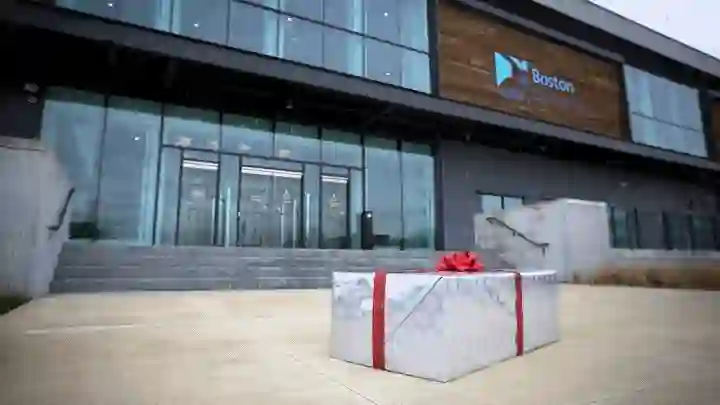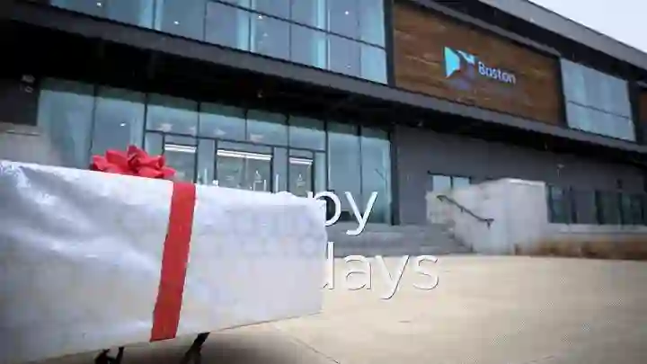 视频中,微微飘着雪花的波士顿大楼门前空地上,安静地“躺着”一个礼物盒子。但是下一秒,这个礼物盒子突然长出了四条腿,伴着圣诞歌曲《铃儿响叮当》,欢快地“逃跑”了。