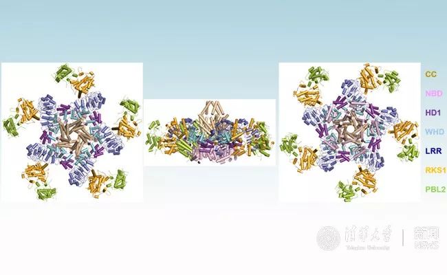 在长期对抗病原生物的过程中,植物进化出了复杂高效的两层免疫系统,用于识别各种病原微生物、激活防卫反应保护自己。处于两层免疫系统的核心是植物细胞内数目众多的抗病蛋白,它们既是监控病虫侵害的哨兵,也是植物动员高效防卫系统的指挥官。抗病蛋白被发现及在植物育种中大量应用已有20多年,但人们对其发挥作用的分子机制仍不清楚。清华大学柴继杰团队、中国科学院遗传与发育生物学研究所周俭民团队、以及清华大学王宏伟团队最近的联合研究,在植物免疫研究领域取得历史性的重大突破。合作团队发现由抗病蛋白组成的抗病小体并解析了其处于抑制状态、中间状态及五聚体活化状态的冷冻电镜结构,从而揭示了抗病蛋白管控和激活的核心分子机制。相关成果以两篇长文(Research Article)形式,分别以“病原蛋白诱导的ADP解离启动植物抗病蛋白”(Ligand-triggered allosteric ADP release primes a plant NLR complex)和“植物抗病小体的重组和结构功能基础”(Reconstitution and structure of a plant NLR resistosome conferring immunity)为题目,于2019年4月5日发表在国际权威学术期刊《科学》(Science)上。《科学》杂志同期发表了国际植物抗病研究权威科学家Jeffery Dangl和Jonathan Jones撰写的题为“耀眼的五星:植物抗病小体”(A pentangular plant inflammasome)的专文评述,高度评价这一重大突破性成果。