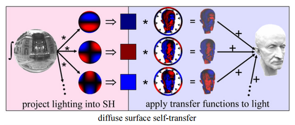 [5] Sloan, Peter-Pike, Jan Kautz, and John Snyder. "Precomputed radiance transfer for real-time rendering in dynamic, low-frequency lighting environments." ACM Transactions on Graphics (TOG). Vol. 21. No. 3. ACM, 2002. http://www1.cs.columbia.edu/~ravir/6998/papers/p527-sloan.pdf